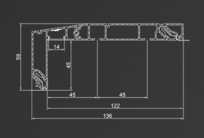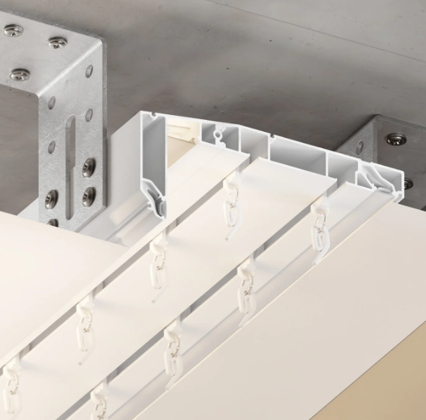 Профиль для изготовления скрытых карнизных ниш с двумя пазами под установку штор и тюля. Увеличенная глубина и расстояние между камерами 45 мм обеспечивают плавный и бесшумный ход бегунков. Пазы под гарпун закрываются PVC-вставкой.
