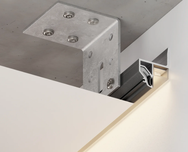 Конструкционный парящий профиль для натяжных потолков с гарпунной системой крепления полотна, паз под гарпун закрывается вставкой. С полкой для светодиодной ленты и креплением для светорассеивающей вставки. Добавлена камера для вкручивания саморезов.
