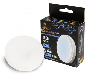 ВС лампа св/д GX53 8W (650lm) 6500K 6K 73x27 матов, пласт/алюм. IC-драйвер 2г